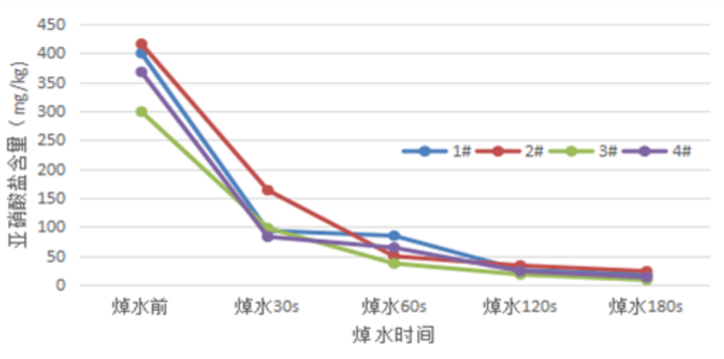 浙江省宁波市居品食物性量检修参谋院食物安全检修中心本领东谈主员曾开展践诺,诀别对香椿进行焯水30秒、60秒、120秒、180秒处理,检测焯水时长对亚硝酸盐含量的影响。
