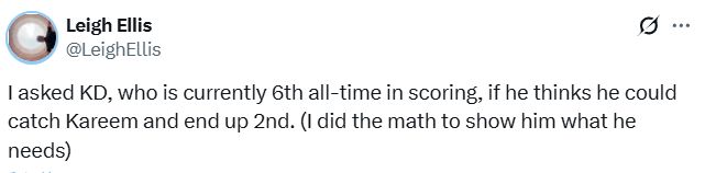 NBA记者埃利斯通过盘算推算后见告杜兰特:要思极端贾巴尔,成为历史得分榜的第二,杜兰特需要在接下来出战的268场比赛中,保握场均25分的水准。