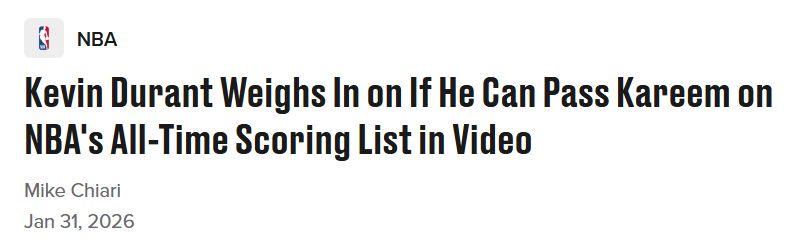 思要极端詹姆斯42821分的历史总得分记载,看起来并不执行,但杜兰特与贾巴尔38387分的记载之间的差距,处于更具可行性的追逐范畴内。