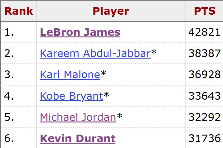 当作15届全明星、4届得分王、2届NBA总冠军、2届总决赛MVP以及1届惯例赛MVP,杜兰特当今以31736分的总得分位列历史得分榜第六位,仅次于勒布朗-詹姆斯、阿卜杜尔-贾巴尔、卡尔-马龙、科比-布莱恩特以及迈克尔-乔丹。
