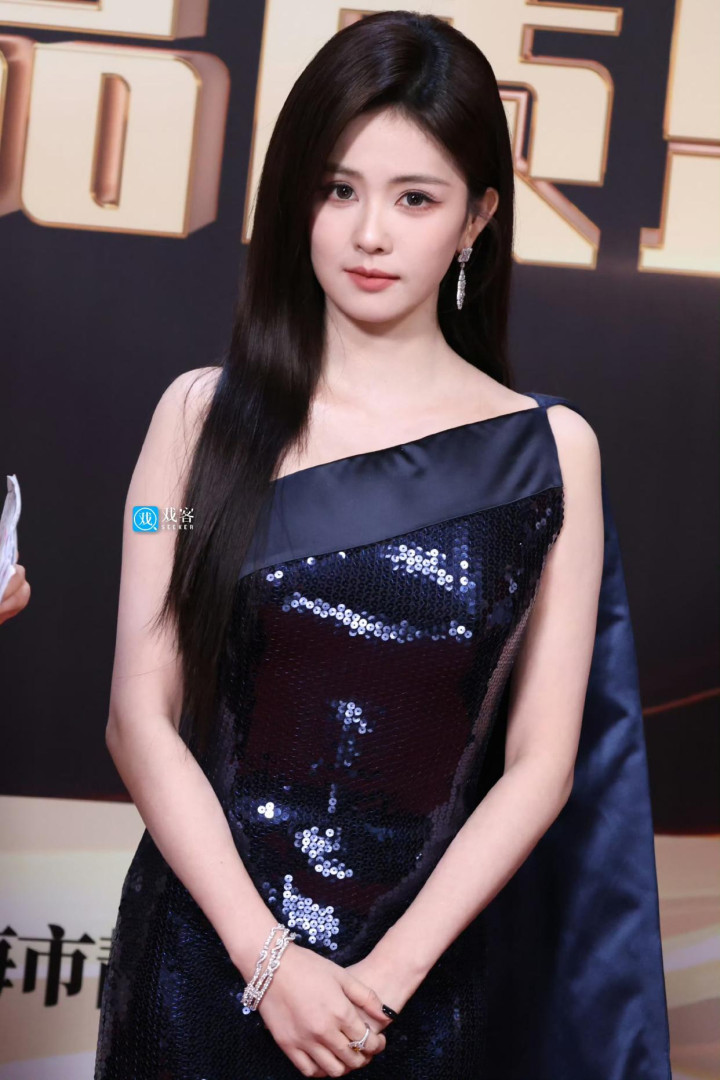 她身着蓝色斜肩亮片披风裙惊艳登场,亮片在灯光卑鄙光溢彩,衬得她肤白胜雪、气质冷艳,气象好到发光。