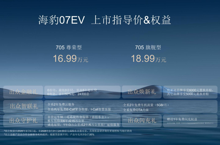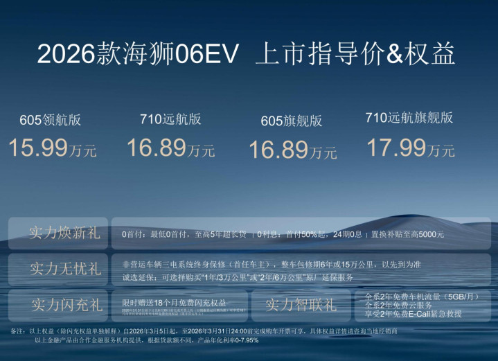 在全场嘉宾的焦躁期待中,两款新车的价钱也在上市盛典中崇敬揭晓,其中,2026款海狮06EV官方换取价为15.99万元-17.99万元,并推出实力焕新礼、实力无忧礼、实力闪充礼、实力智联礼多重购车礼遇;海豹07EV官方换取价为16.99万元-18.99万元,用户还可享出众金融礼、出众焕新礼、出众智联礼、出众看管礼、出众闪充礼多项购车礼遇。
