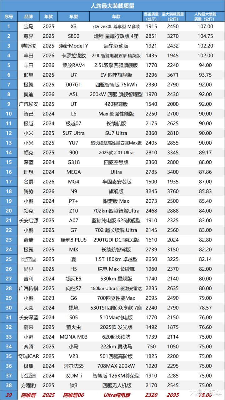 咱们这辆车的整备质料为2320千克,最大满载质料为2695千克,计较得出这辆阿维塔06 Ultra纯电版的东谈主均最大装载质料为75千克,刚刚适正当式。