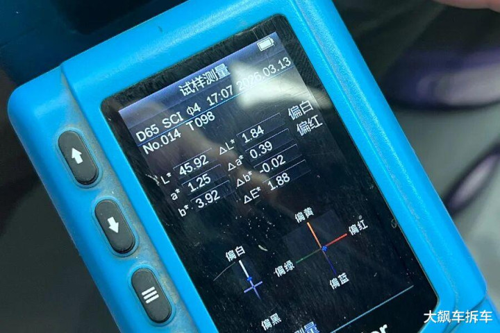 过程测试,最大色差值位于后保障杠处,色差值为1.88ΔE,比基准点偏白偏红。从数值上来看,这辆车的喷漆工艺质料规则,相对相比一般。