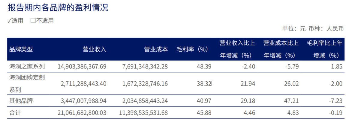 分品牌看,海澜之家旗劣品牌布局多元,包括主品牌海澜之家、职场女性衣饰品牌OVV、简潮前锋男装品牌黑鲸、高端婴童生涯式样品牌英氏、竞技默契品牌HEAD、海澜团购定制业务,并与阿迪达斯、京东奥莱达成策略协作。主品牌海澜之家营收同比下落2.4%至149.03亿元;海澜团购定制营收增长21.94%至27.11亿元;(包括英氏YeeHoO、黑鲸、OVV等在内的)其他品牌业务营收增长29.18%至34.47亿元。