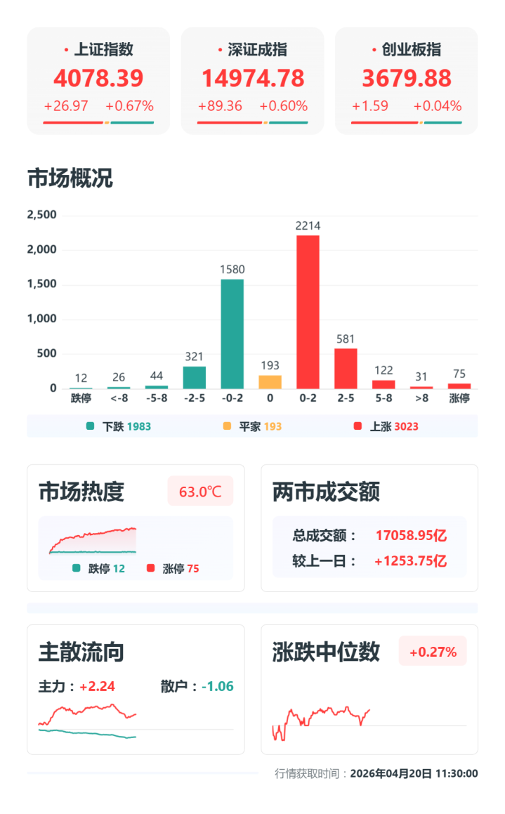 早盘A股三大指数颠簸走高,闭幕午间收盘,沪指涨0.67%,报4078.39点,深成指涨0.6%,报14974.78点,创业板指涨0.04%,报3679.88点,科创50指数涨1.64%,报1446.65点。沪深两市超3000只个股高潮,整个成交额17058.95亿元,较上一往还日放量1253.75亿元。