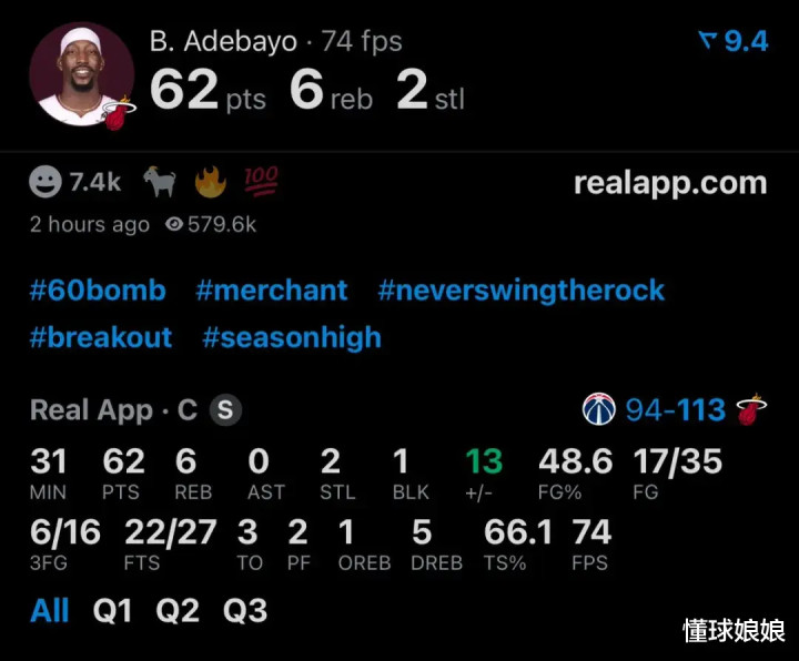 半场适度,阿德巴约的得分也曾来到了43分,破损了由詹姆斯创下的队史记载(37分,下半场)。NBA上半场得分历史记载是唐斯的44分。三节打完,阿德巴约也曾拿到了62分。三节就破损了詹姆斯创下的热火队史单场得分记载,一个晚上,阿德巴约把詹姆斯在热火留住的队史图章洗了个七七八八。上一个能三节拿到62分的球员,本宫能思到的照旧科比呢。