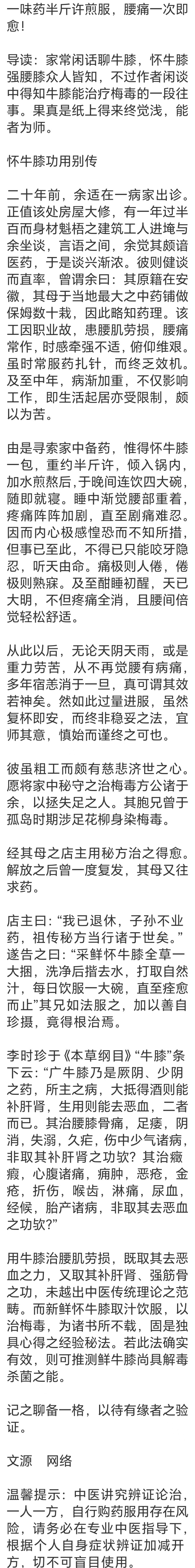 这一味草木,从田间地头走来,经等闲东说念主的切身考证,在时光里,迟缓成为颐养腰疾的良方。它告诉咱们,颐养的力量从不在复杂的配伍里,而在这些朴素的实行与共享里,在草木与当然的祥和对话里,在为他东说念主着思的善意里。