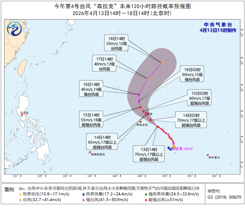 本年第4号台风“森拉克”于北京技艺4月12日凌晨加强为超强台风级,13日上昼8时,它的中心来到了好意思国关岛东偏南边向约470公里的西北太平洋洋面上,中心近邻最大风力有17级以上(70米/秒)。目下,“森拉克”八成率正面要紧塞班岛,它的强度甚而可能普及八年前的“玉兔”。