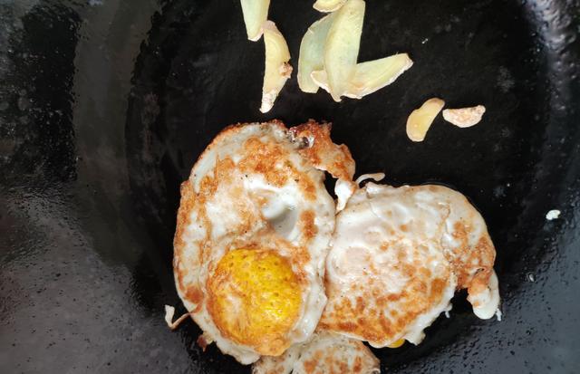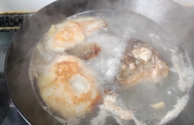 启动熬鱼头汤了,把鱼头鱼尾放进锅里,用劲煸锅,直到鱼头鱼尾稍微有点糊才行。