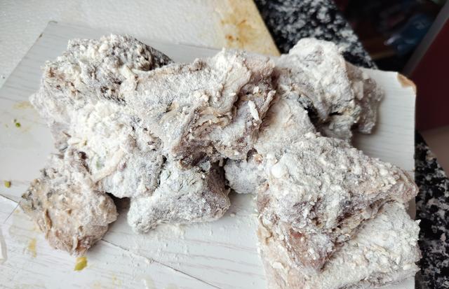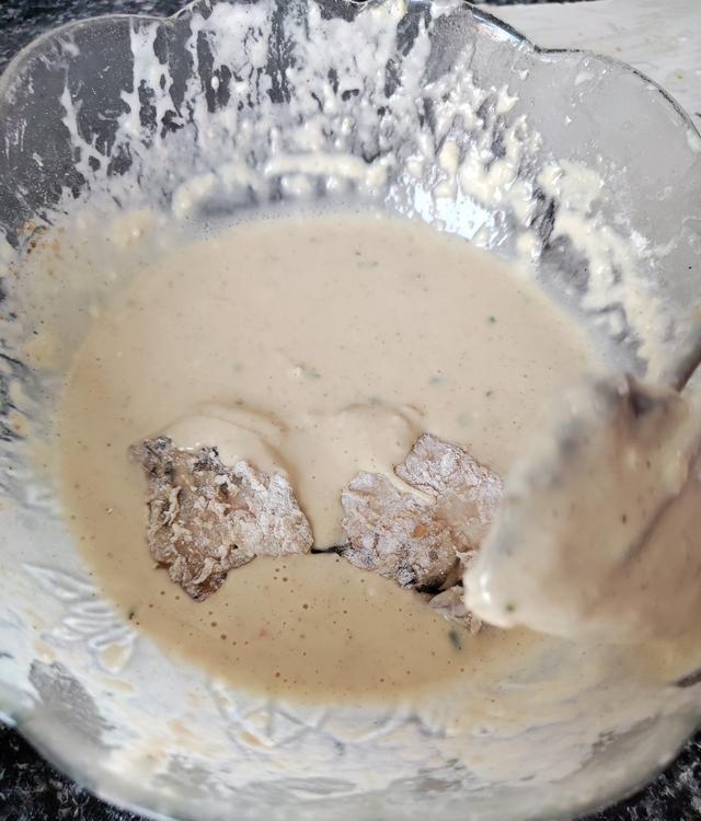 用玻璃盆和好面糊,把腌好的鱼块,放在面板上,先沾上一些干面粉,然后再鱼放进面糊里,挂上一层面。我格外心爱吃油炸的鱼面,就派遣细君多挂一些面糊。