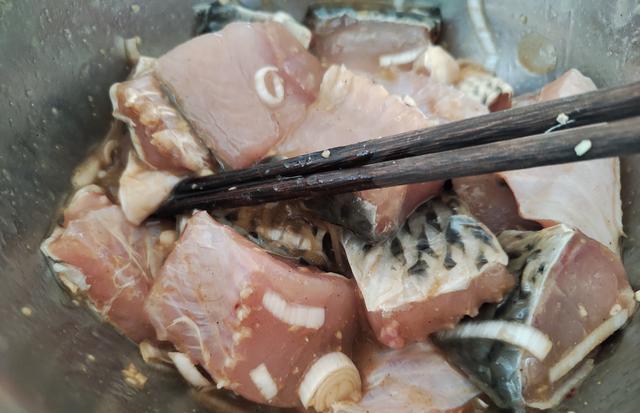 鱼身剁成小块,用料酒,葱花,大料面,食用盐,腌一会。