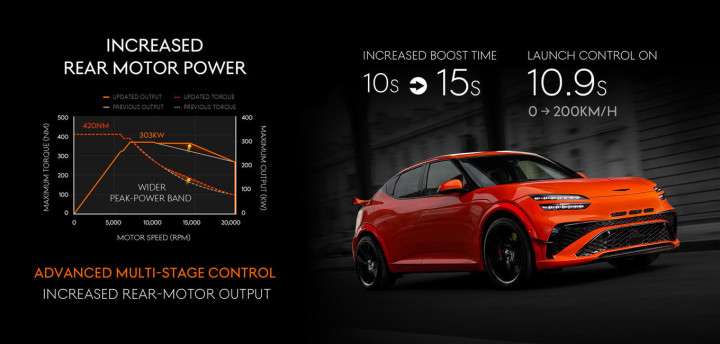 除了硬件的升级,捷尼赛念念还为GV60 Magma引入新一代两级电机戒指系统,用于冲破传统电动车在中后段加快时的能源领域。Boost时势可在15秒内开释最大输出功率。